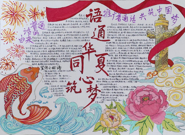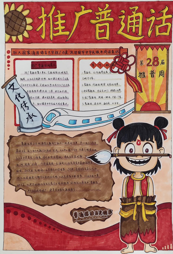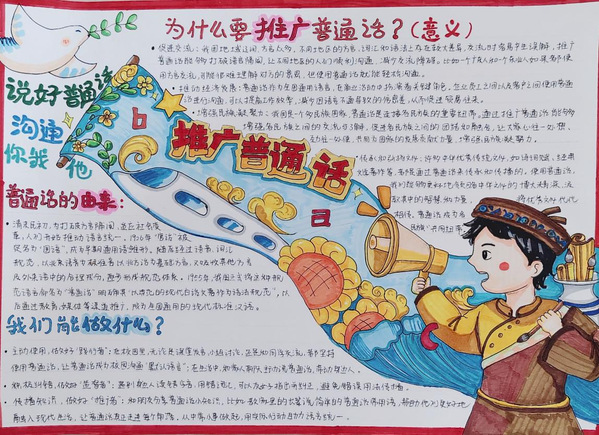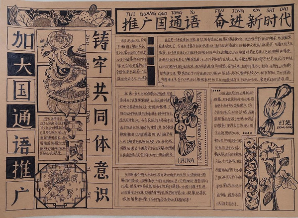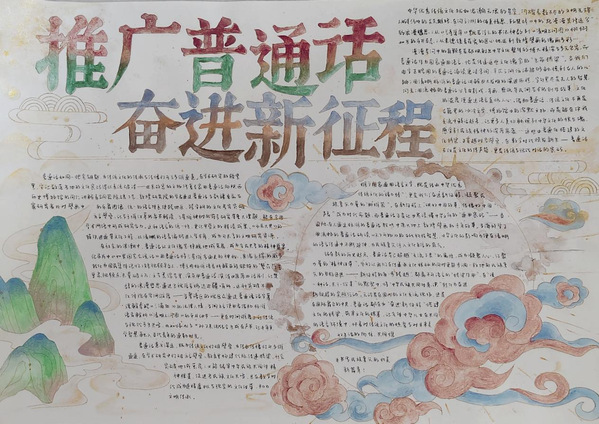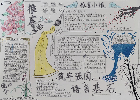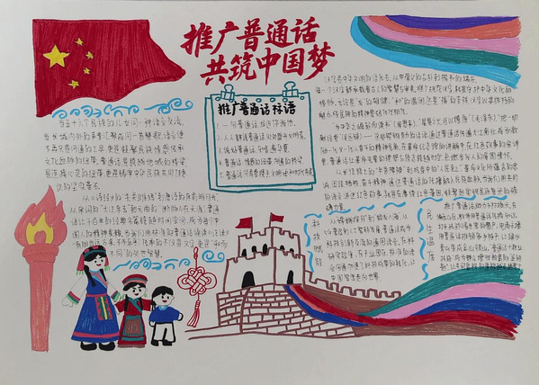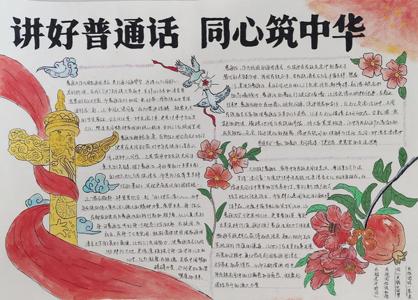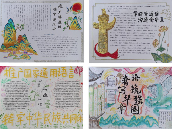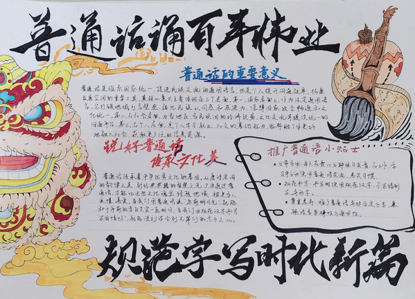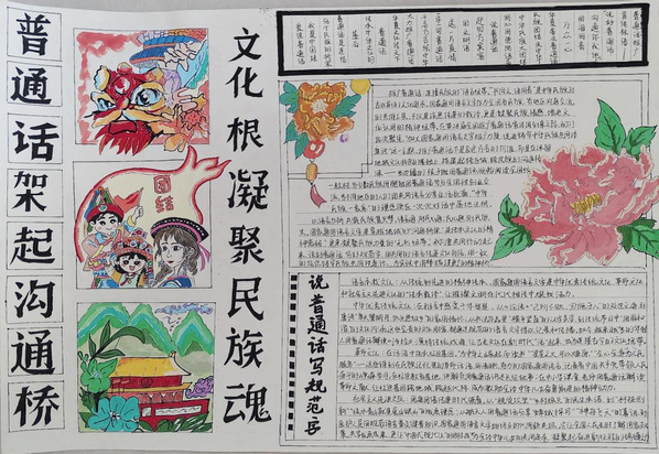 “说好普通话,写好规范字”,这不仅是语言文字传承的核心要义,更是凝聚民族精神、传递文化力量的重要纽带。2025年9月第三周为第28届全国推广普通话宣传周(以下简称“推普周”),此次推普周的主题为“加大国家通用语言文字推广力度,促进铸牢中华民族共同体意识”。为扎实开展推普周活动,营造学习使用国家通用语言文字的良好氛围,我校教务处、普通话水平测试站、国家语言文字推广基地(东华理工大学)联合组织开展“主题手抄报大赛”活动。自活动开展以来,吸引了众多同学踊跃参与,大家以笔为媒、以画为语,将对国家通用语言文字的理解与热爱,融入一张张色彩鲜明、创意十足的手抄报作品中,涌现出一大批兼具思想性与艺术性的优秀佳作。