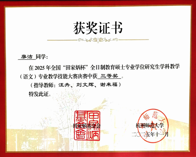 长期以来,学院以教师教学能力竞赛为重要载体,着力强化教育硕士教学技能的系统化建设。为备战“田家炳杯”,学院选派多名教师,围绕课程设计、课件制作、教态表达、视频录制等环节,实施多轮指导,助力学生在教学目标定位、教学内容选择、教学方法创新等方面取得突破。此次获奖既是对廖洁同学专业能力的充分肯定,也为学院学科教学(语文)专业的人才培养注入了新动力。未来,学院将持续深化“实践育人”理念,聚焦教育硕士核心素养的提升,强化研究生专业技能培养,致力于为基础教育输送更多高素质的语文教师。(文/图 汪卉)