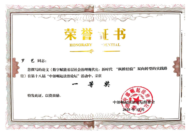 近日,第十八届“中部崛起法治论坛”在湖南省怀化市举行。会议由江西、湖南、湖北、安徽、河南、山西6个省级法学会共同主办,湖南省法学会承办。会上公布了中国法学会第十八届“中部崛起法治论坛”获奖论文名单,我院法学系教师罗艺副教授撰写的论文《数字赋能基层社会治理现代化:新时代“枫桥经验”双向转型的实践路径》荣获一等奖。
