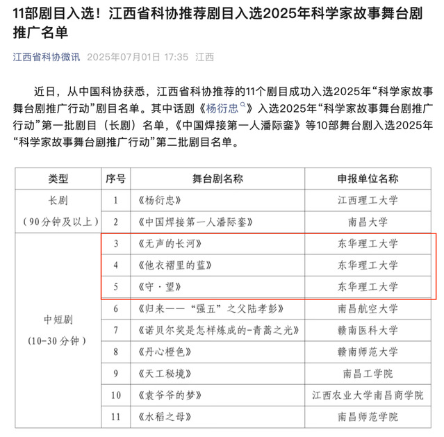 近日,中国科学技术协会公布了2025年“科学家故事舞台剧推广行动”入选剧目名单,由江西省科协推荐的东华理工大学原创中短剧《无声的长河》《他衣褶里的蓝》《守望》成功入选。