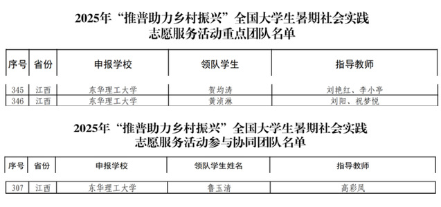 近日,由教育部语言文字应用管理司、共青团中央青年发展部组织开展的2025年“推普助力乡村振兴”全国大学生暑期社会实践志愿服务活动团队评选结果正式公布。东华理工大学“普惠乡村”服务队、“灯塔”志愿服务团队成功入选重点团队,“青春芯工”暑期实践队成功入选协同团队。