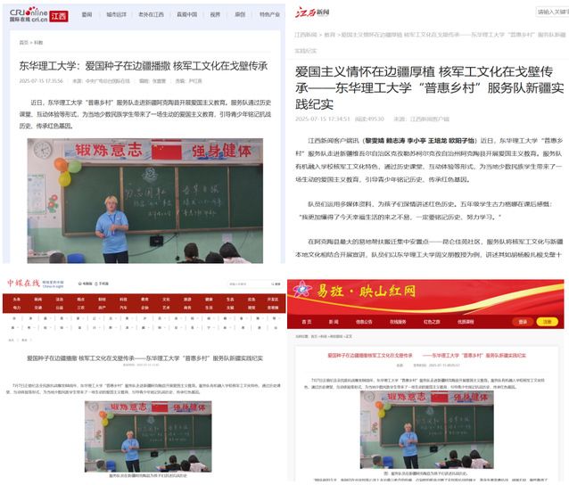 编者按:7月7日正值纪念全民族抗战爆发88周年,东华理工大学“普惠乡村”服务队走进新疆阿克陶县开展爱国主义教育。国际在线、江西新闻、中媒在线、映山红网等主流媒体对此进行报道,引发社会广泛关注。现将原文转载如下: