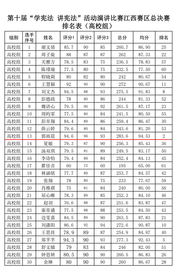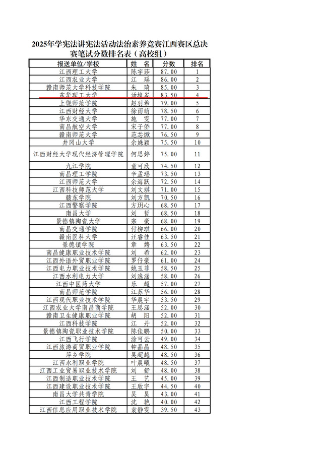 11月2日,由中共江西省委教育工委、江西省教育厅主办,教育部全国青少年普法网协办的第十届全国学生“学宪法 讲宪法”演讲比赛江西赛区总决赛圆满落幕。东华理工大学2024级旅游地学与规划工程专业学生郭雨晨获演讲比赛高校组二等奖(全省总排名第2),2022级法学专业学生汤镜岑获法治素养竞赛高校组二等奖(全省总排名第4),教师文竹、郑华分别获评优秀指导教师二等奖。