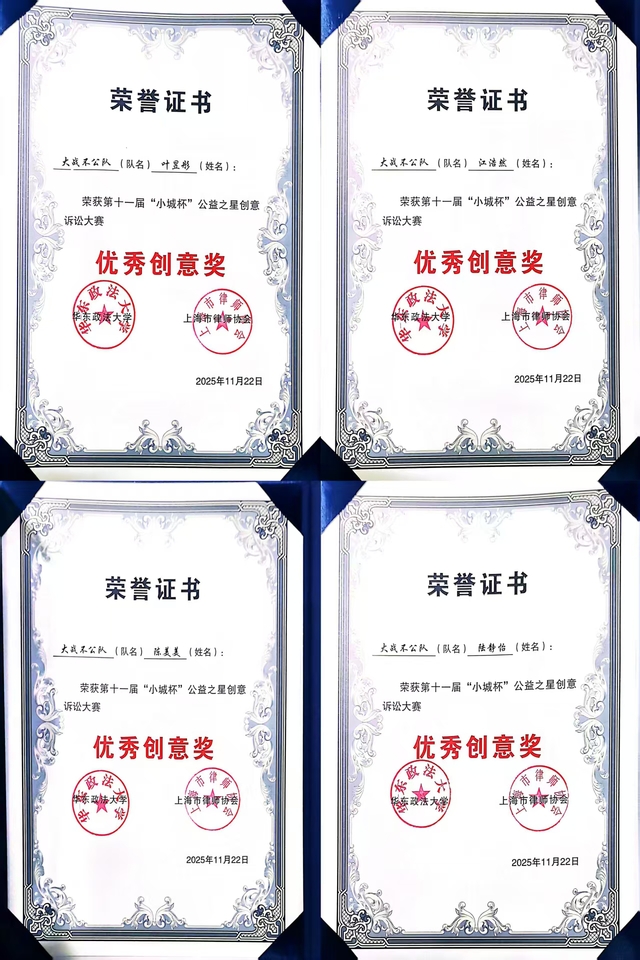 11月22日,由上海市司法局指导,华东政法大学、上海市律师协会主办的第十一届“小城杯”公益之星创意诉讼大赛决赛暨第十二届启动仪式在华东政法大学松江校区顺利举办。我院2023级学生组成的“大战不公队”凭借扎实的专业功底与新颖的公益创意,在众多参赛队伍中脱颖而出,斩获优秀创意奖。